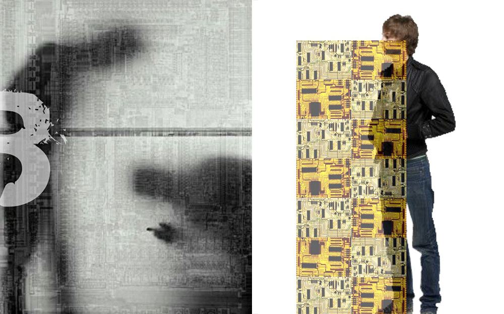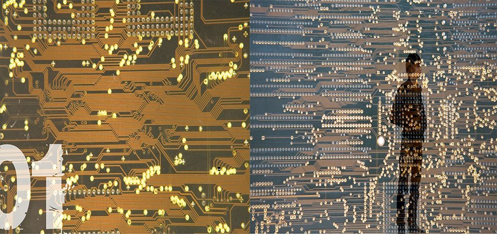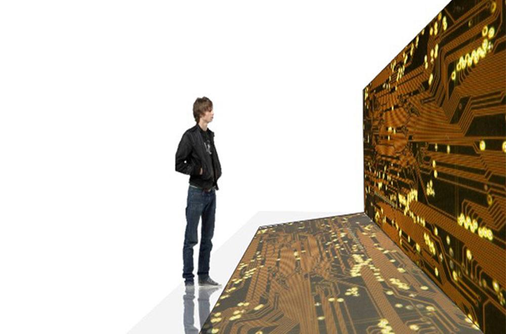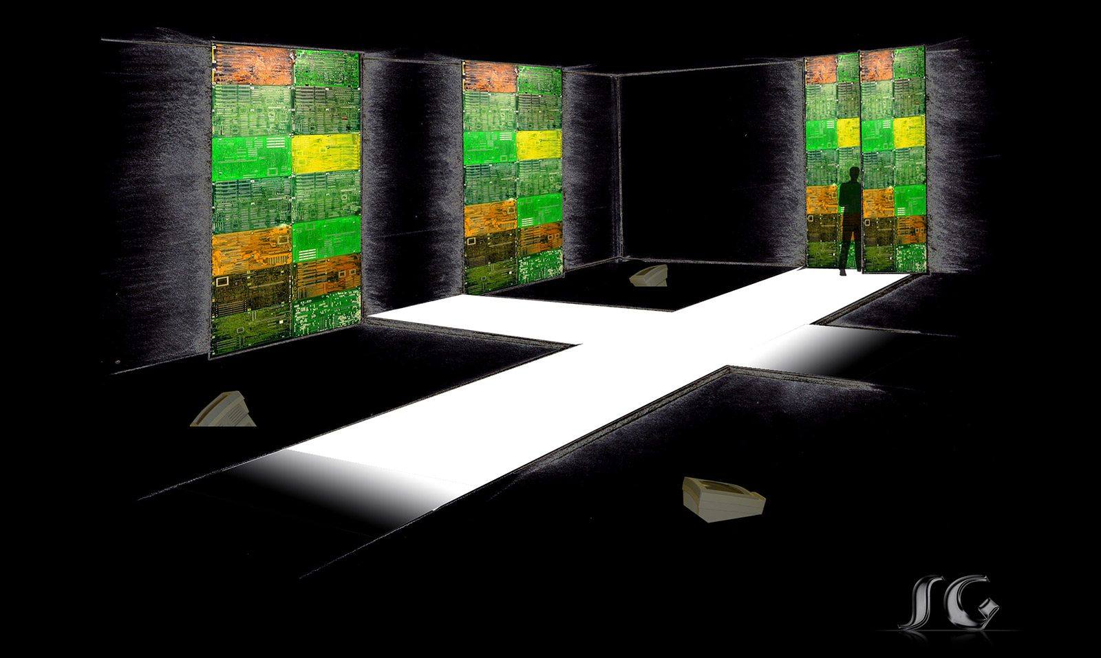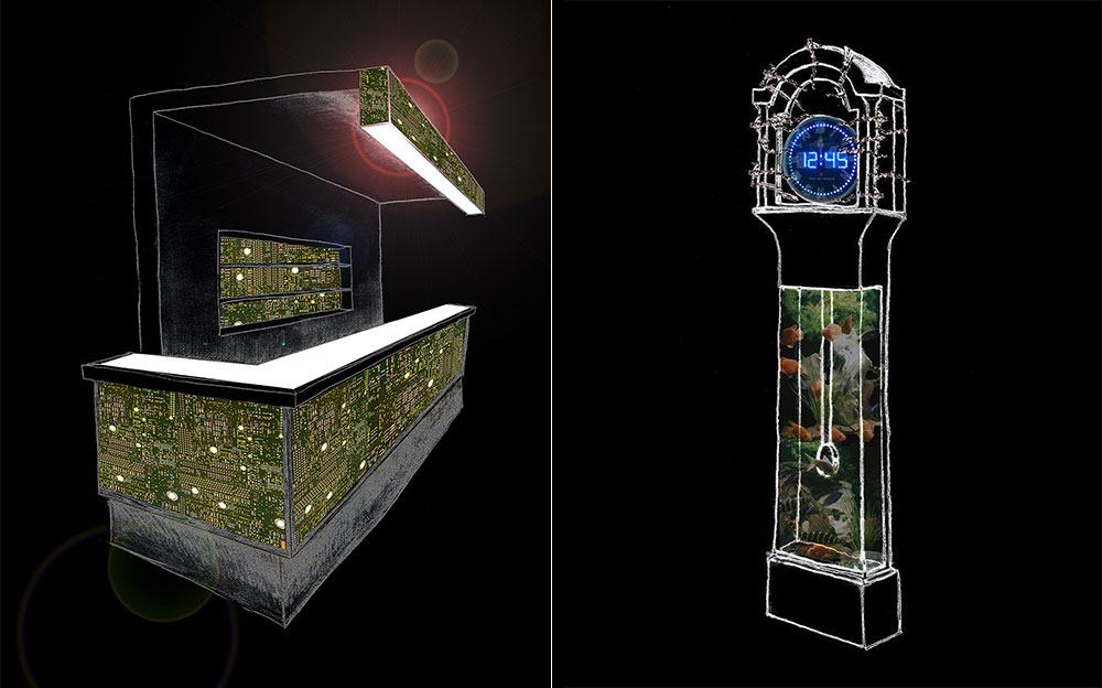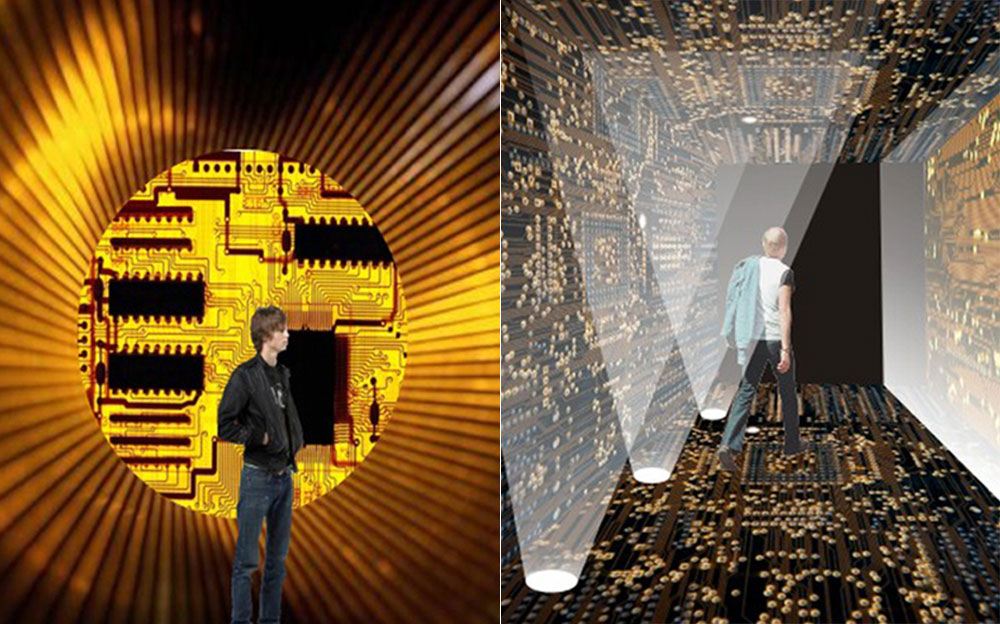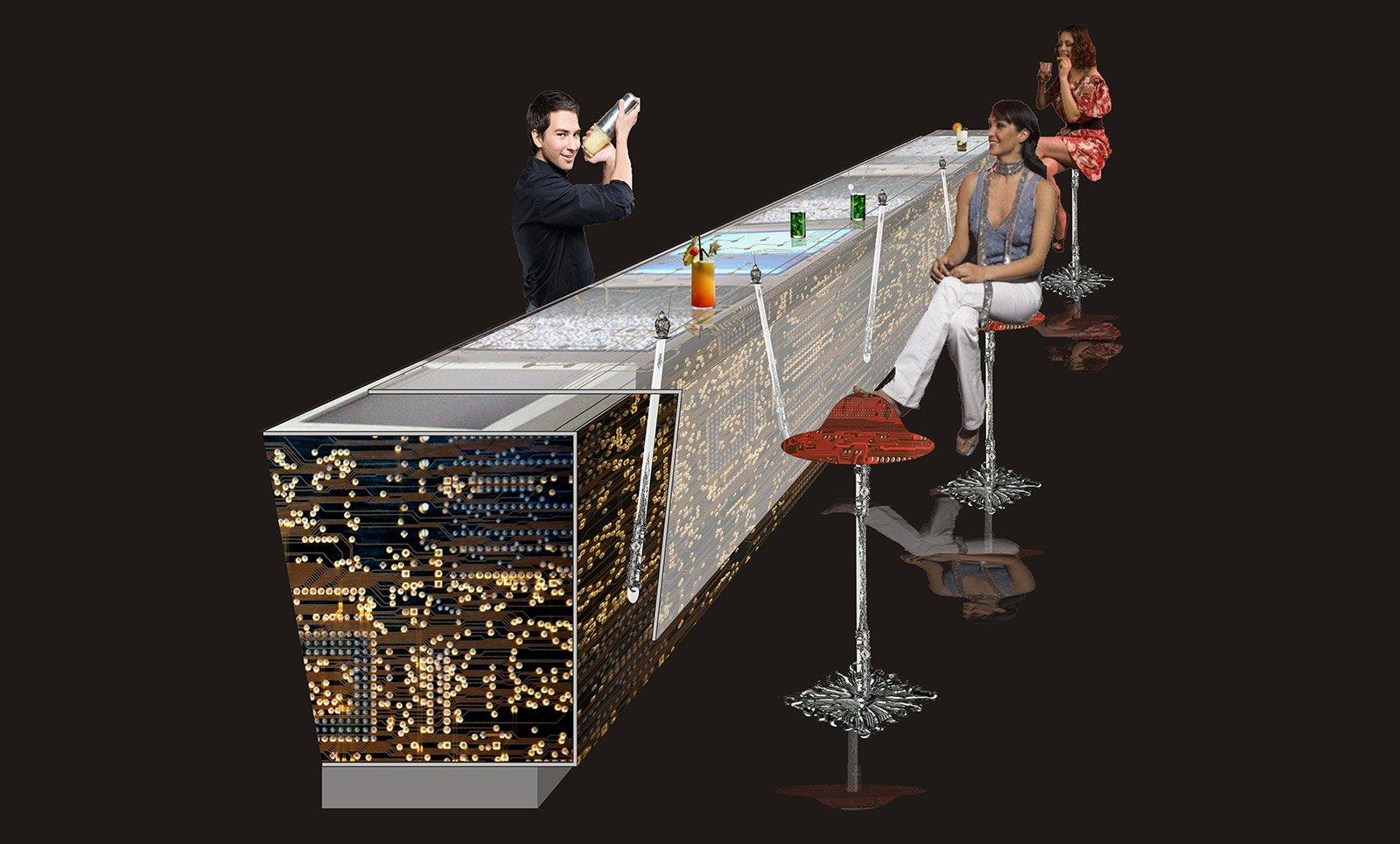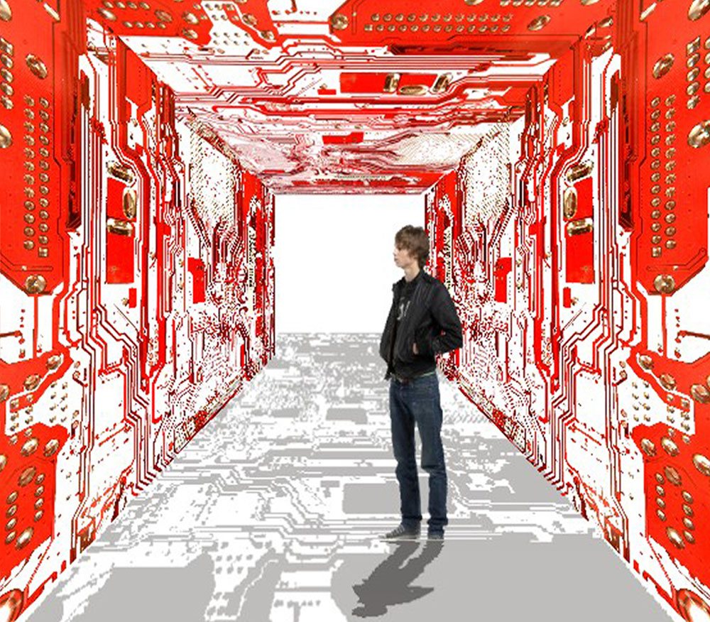 The gallery itself is a tech artform. Its interior designs and furniture were developed using computer circuit boards and artifacts we throw away and the imagery derived from them.
