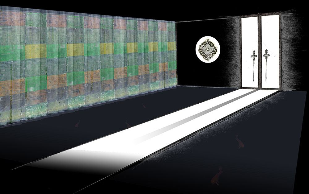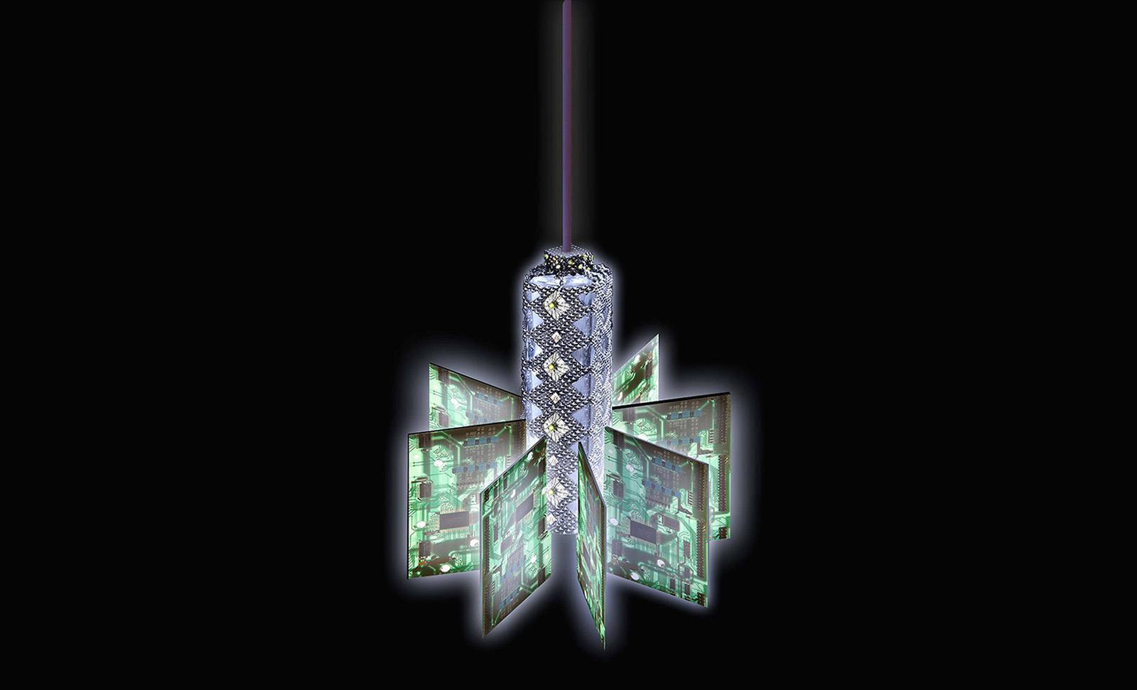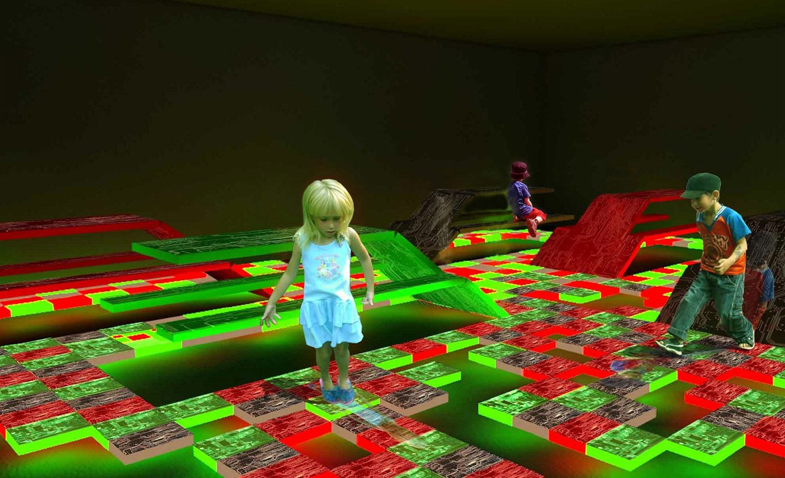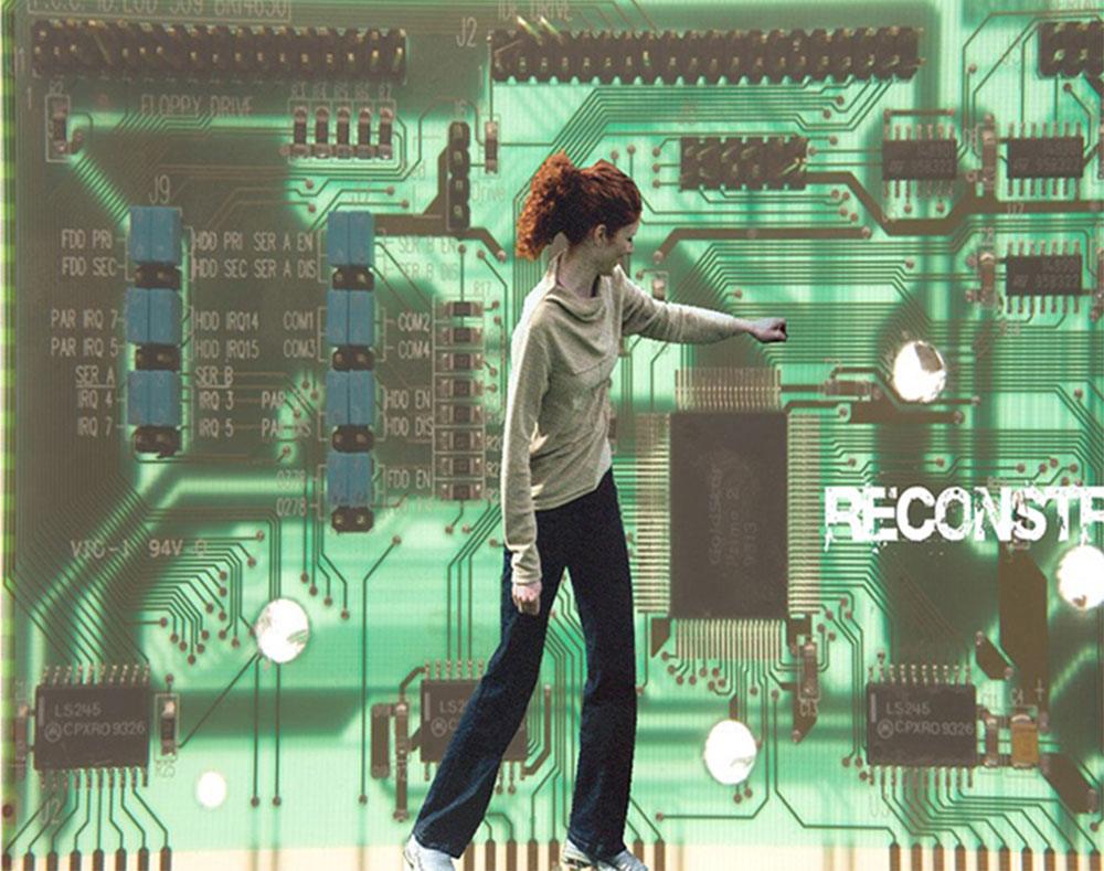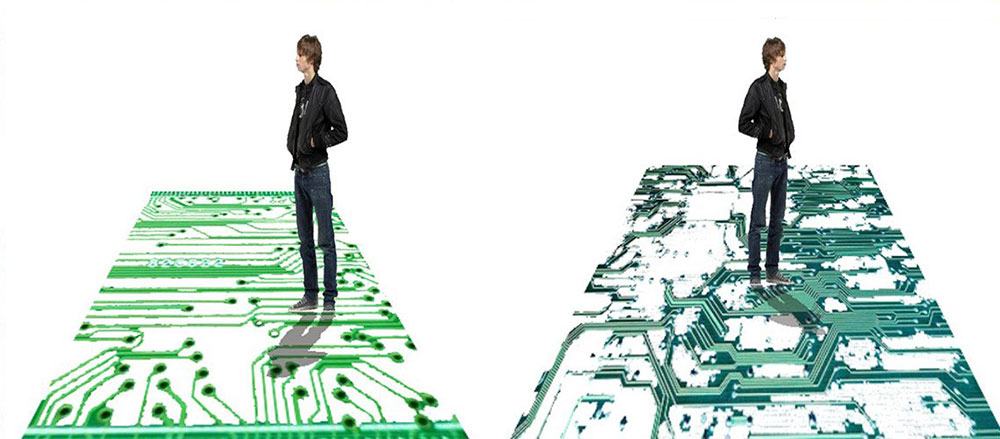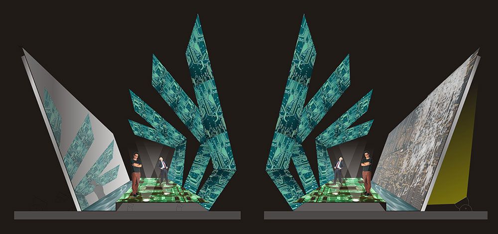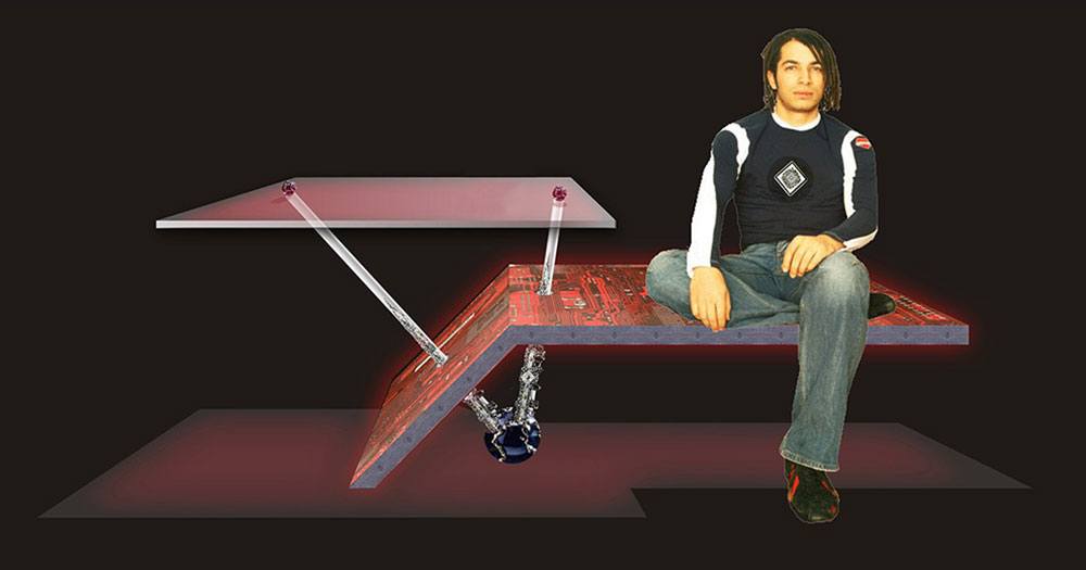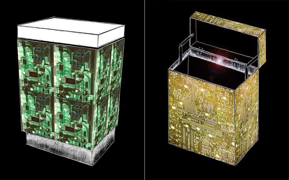 The gallery itself is a tech artform. Its interior designs and furniture were developed using computer circuit boards and artifacts we throw away and the imagery derived from them.